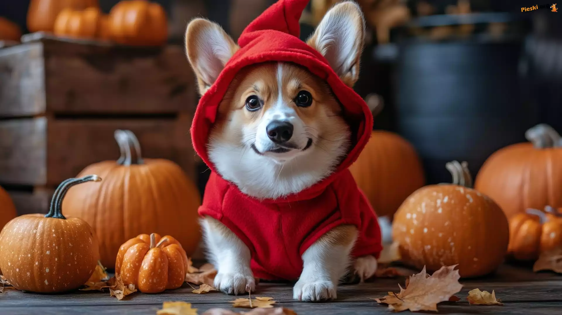AI, Welsh corgi pembroke, Czapka, Dynie, Pies, Czerwone, Ubranko, Pieski