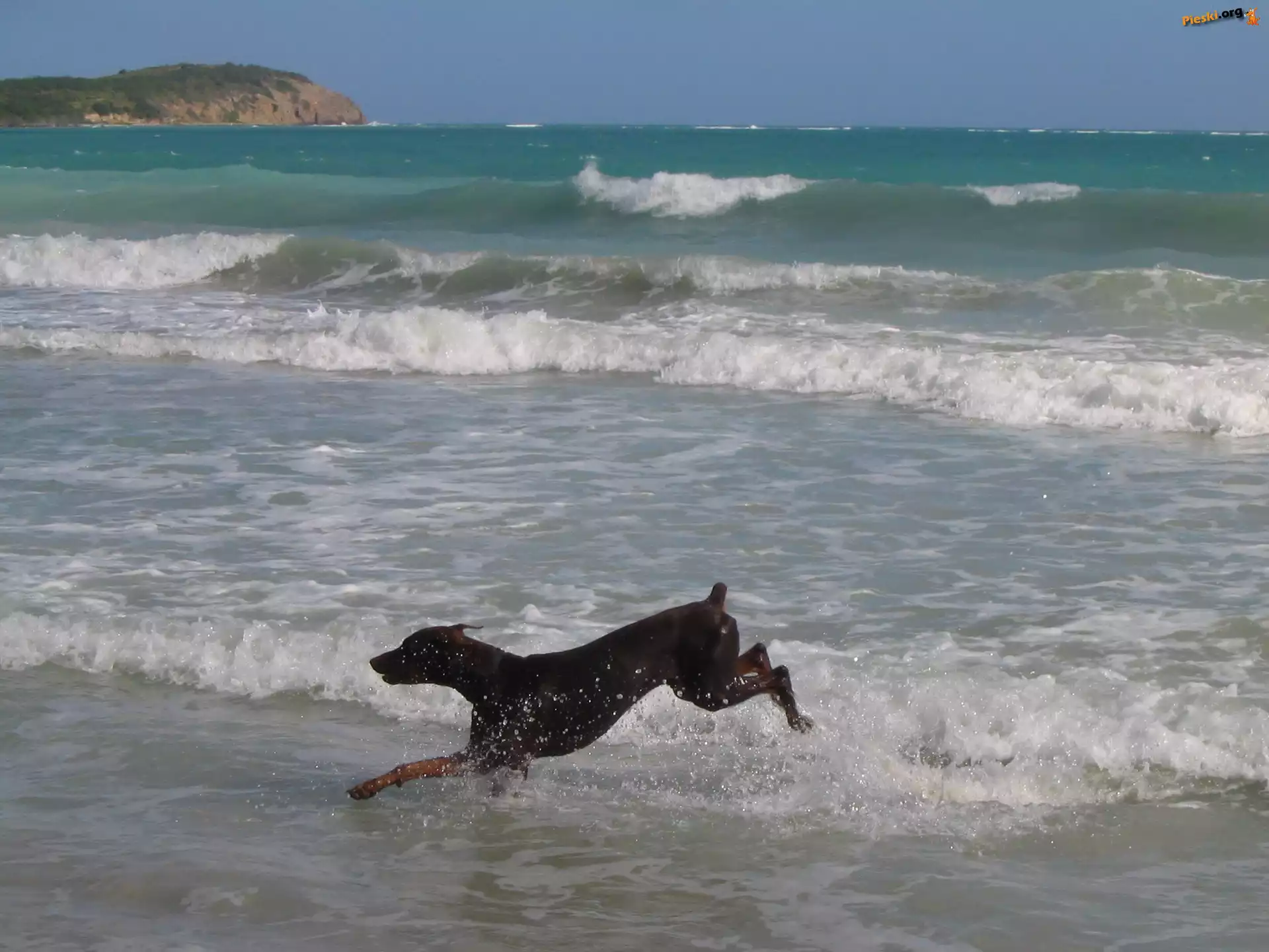 Doberman, Pysk Doberman, Łąka, Język, Czarny, Pies, Piłka Pies, Doberman Doberman Pies, Doberman, Paprocie Biegnący, Doberman, Plaża Doberman Pokój, Doberman, Pies, Światło Bronzowy, Doberman
