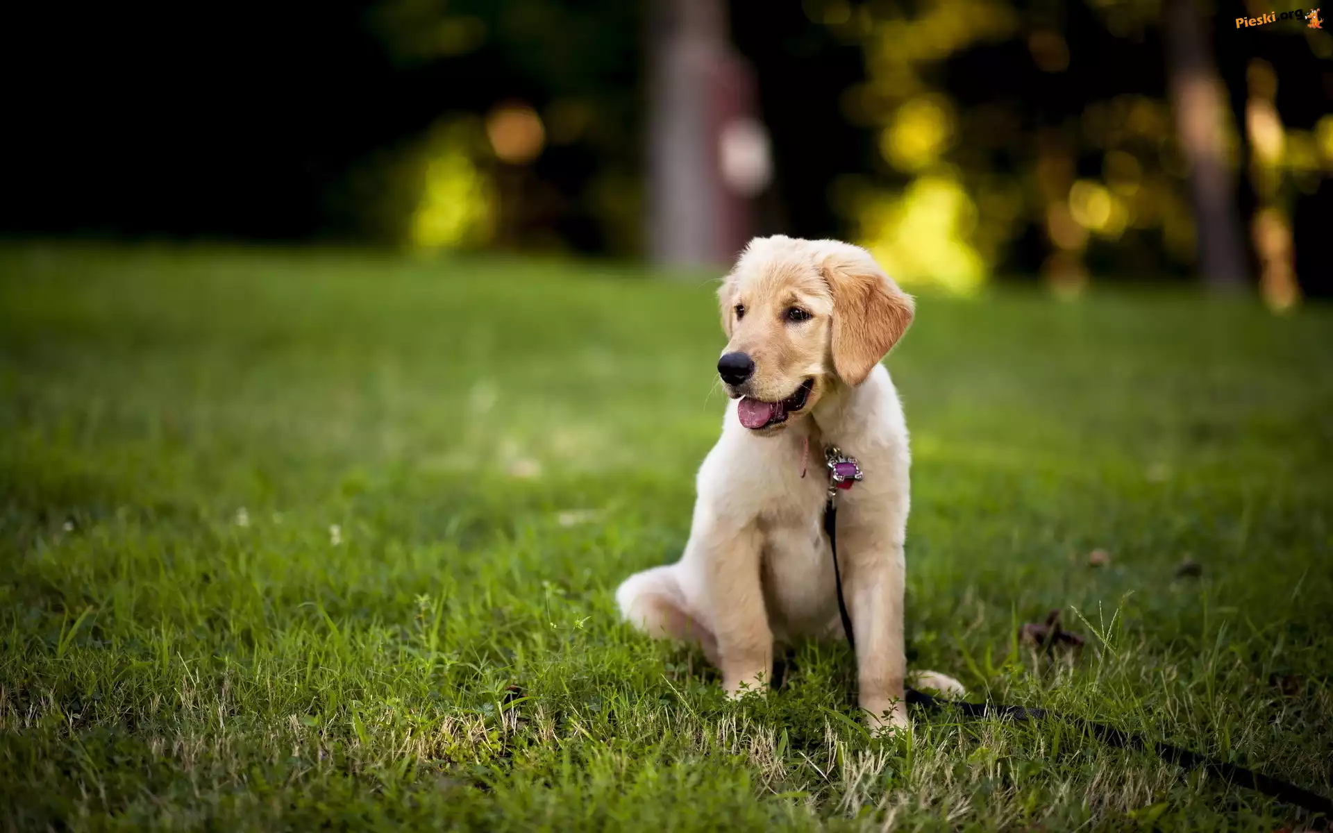Golden Retriever, Szczeniak, Smycz, Pieski