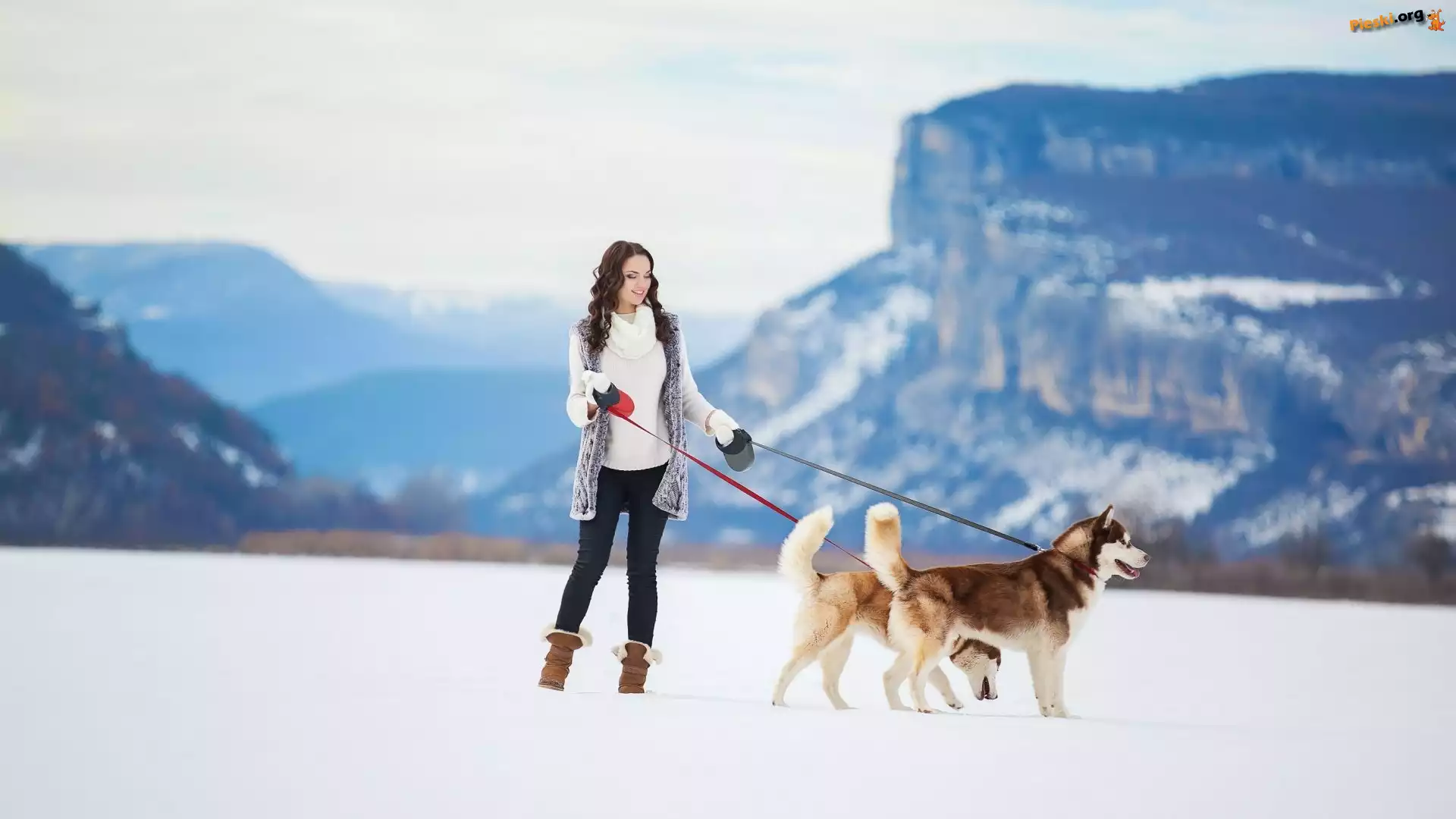 Dziewczyna, Góry, Siberian husky, Dwa, Psy, Zima