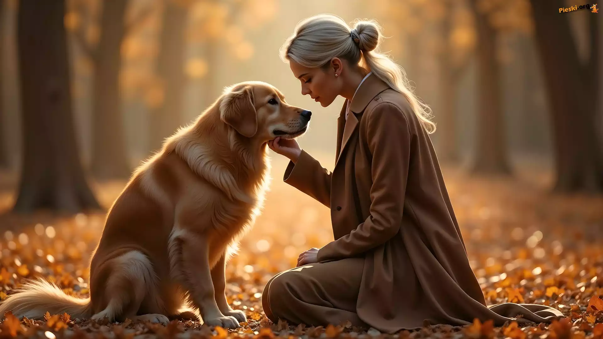 Jesień, Blondynka, Płaszcz, Kobieta, Golden retriever, Pies, Pieski