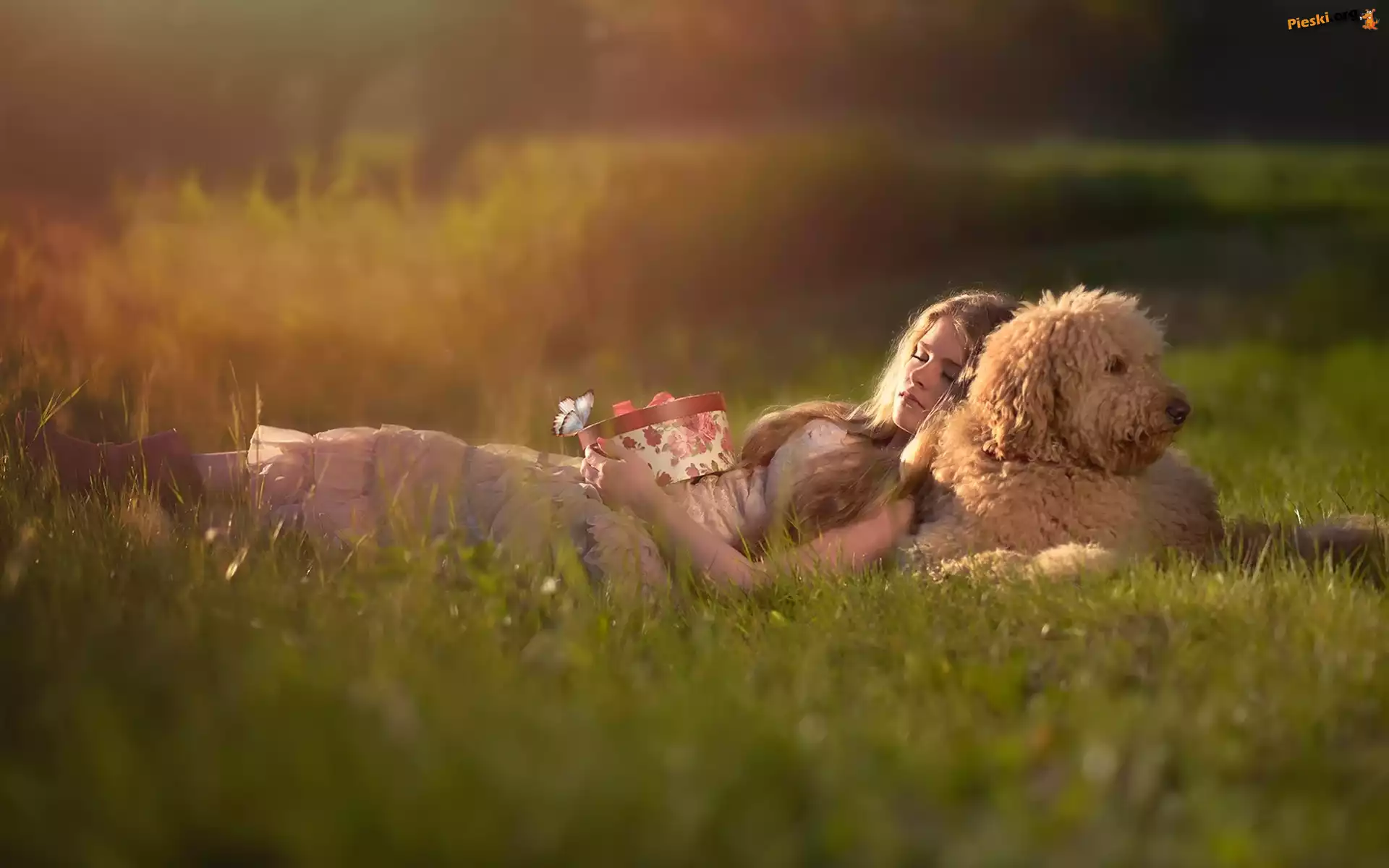 Trawa, Kobieta, Prezent, Labradoodle, Pies, Łąka, Trawa, Pieski