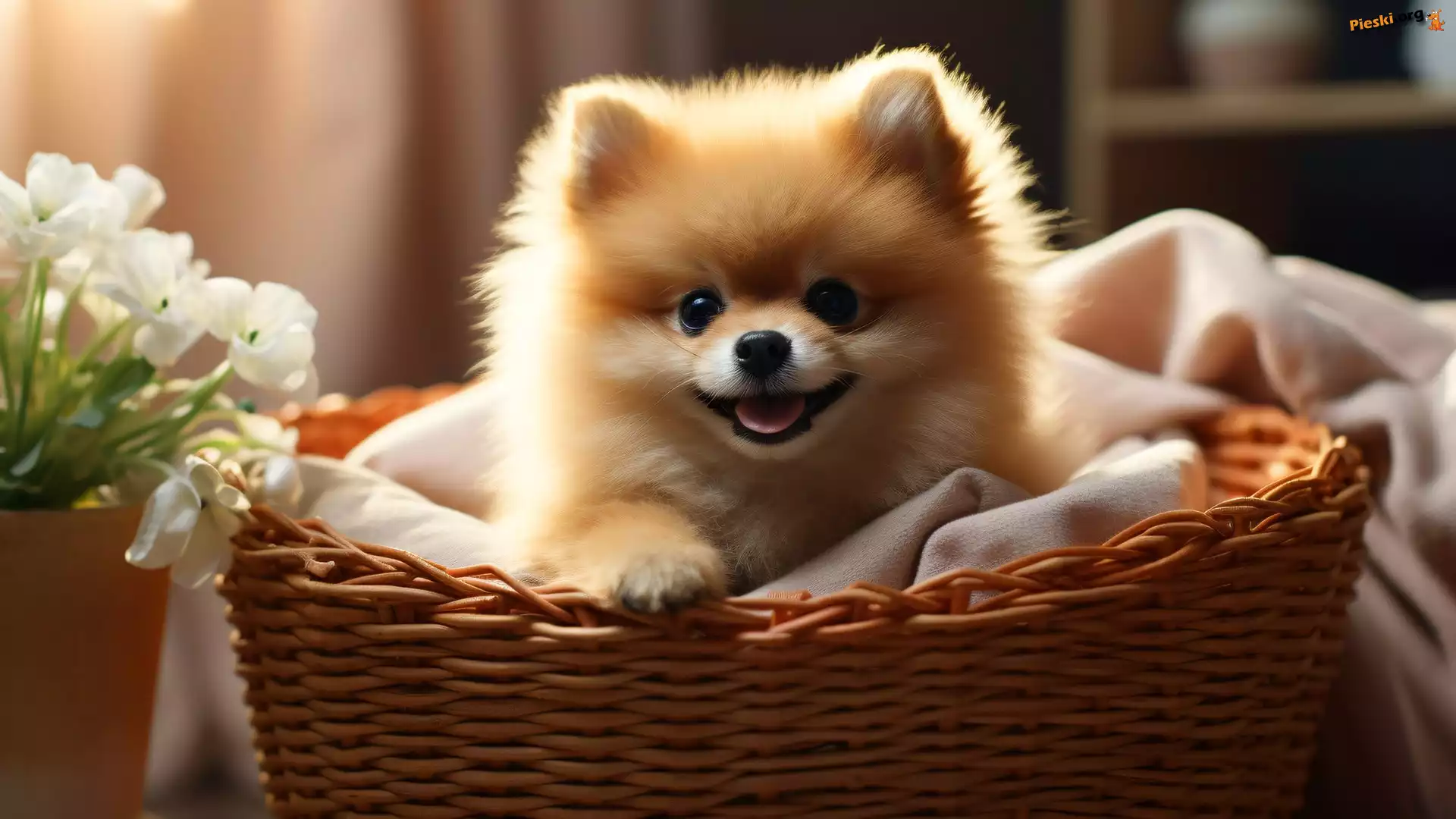 Kwiaty, Szpic miniaturowy, Kosz, Pies, Białe, Koc, Pieski