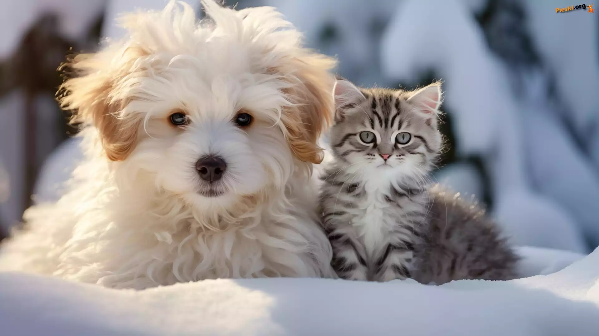Grafika, Zima, Pies, Kot, Pieski