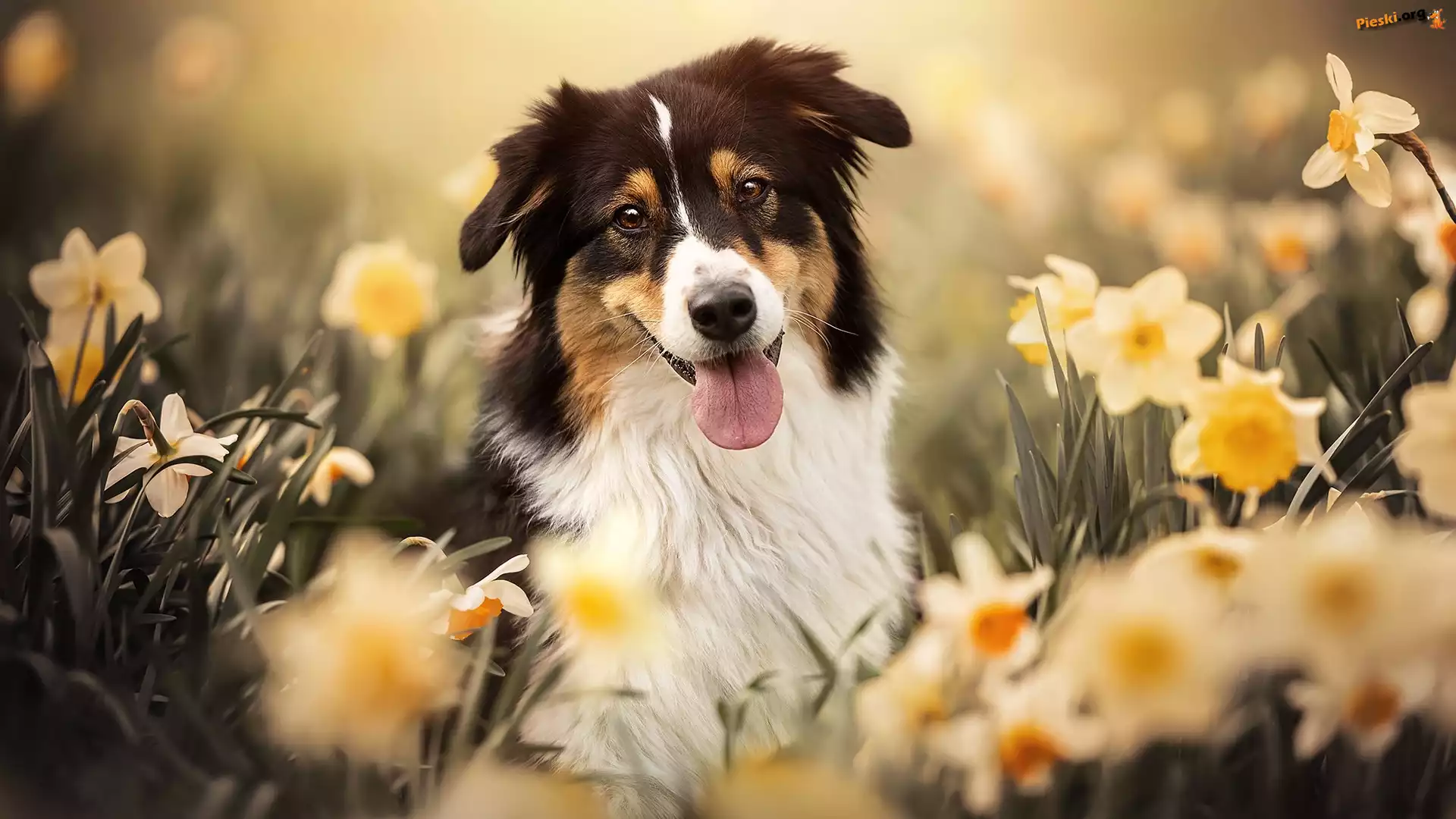 Narcyzy, Kwiaty, Pies, Owczarek australijski