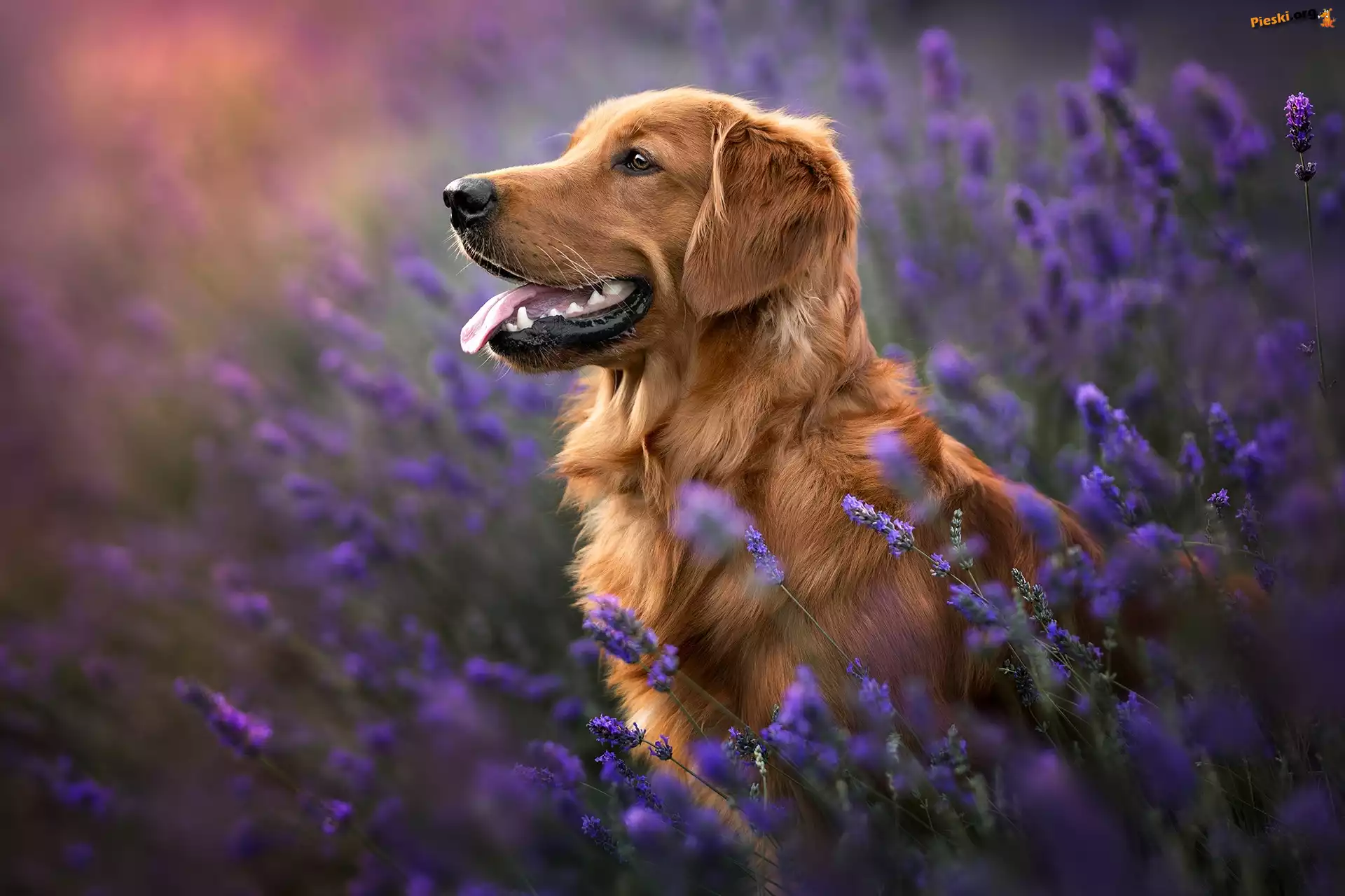 Język, Lawenda, Pies, Kwiaty, Golden retriever, Pieski