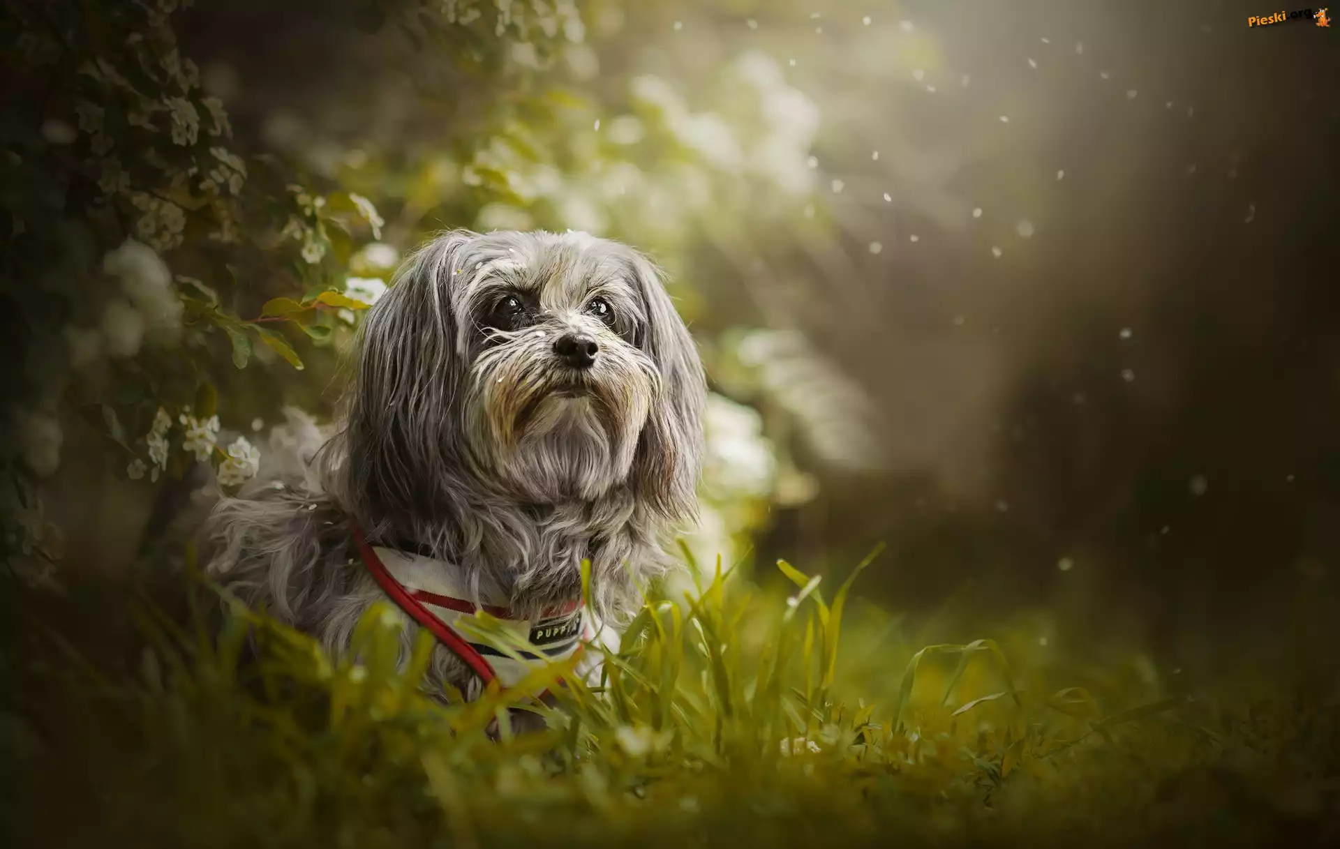 Pies, Trawa Głowa, Lwi piesek, Lowchen, Trawa dwa, białe, Lwi pieski Trawa, Lwi Piesek, Dwa, Szczeniaki Lwi piesek, Trawa, Rośliny Róże, Szary, Piesek