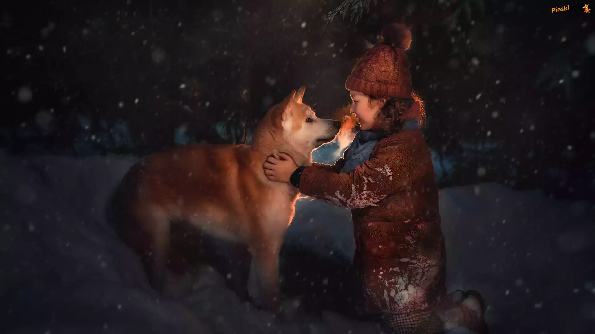 Śnieg, Pies, Dziewczynka, Akita inu, Zima, Pieski