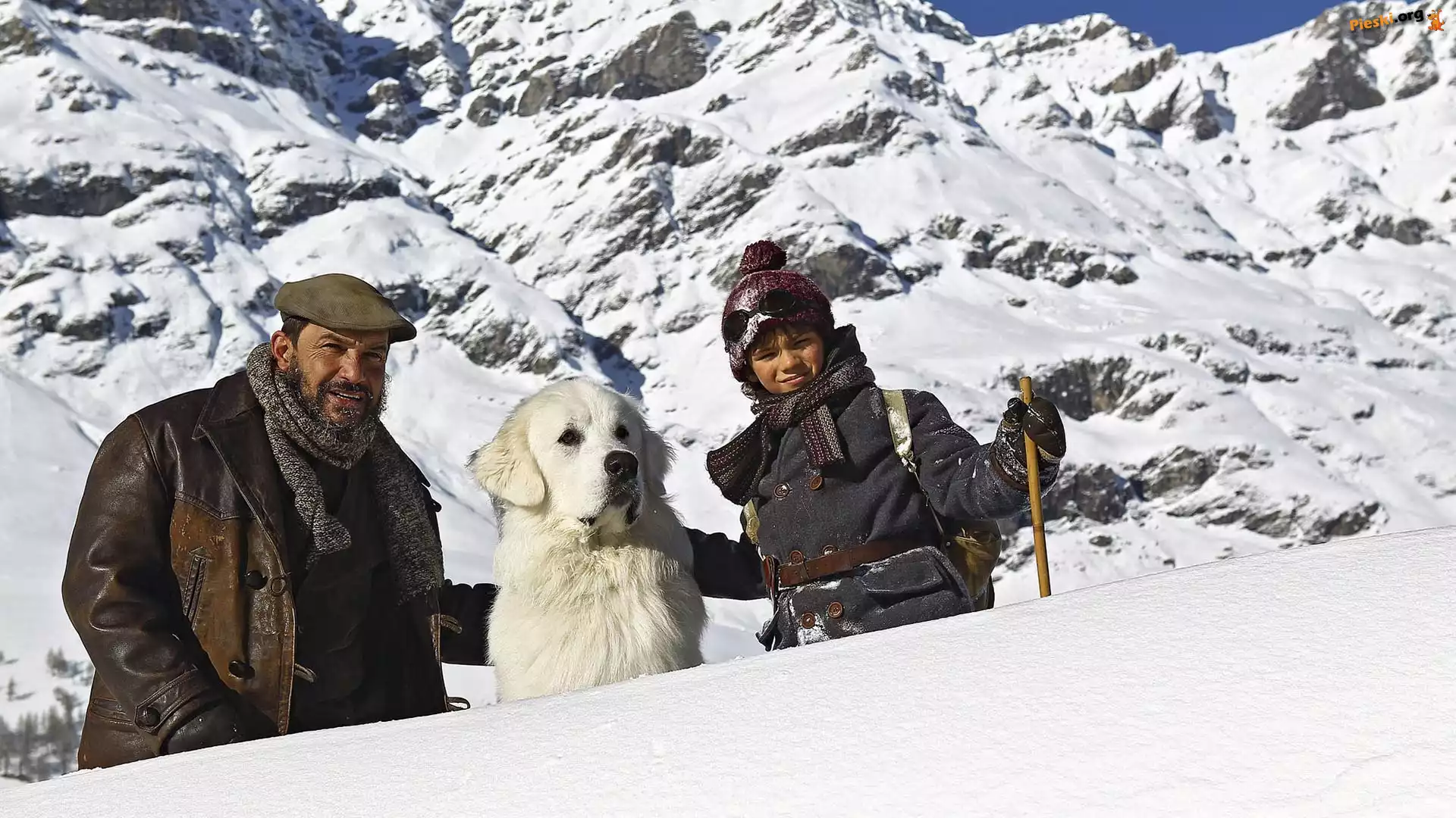 Alpy, Film, Zima Dziecko, Pirenejski pies górski, Bella i Sebastian, Góry, Mężczyzna, Pieski