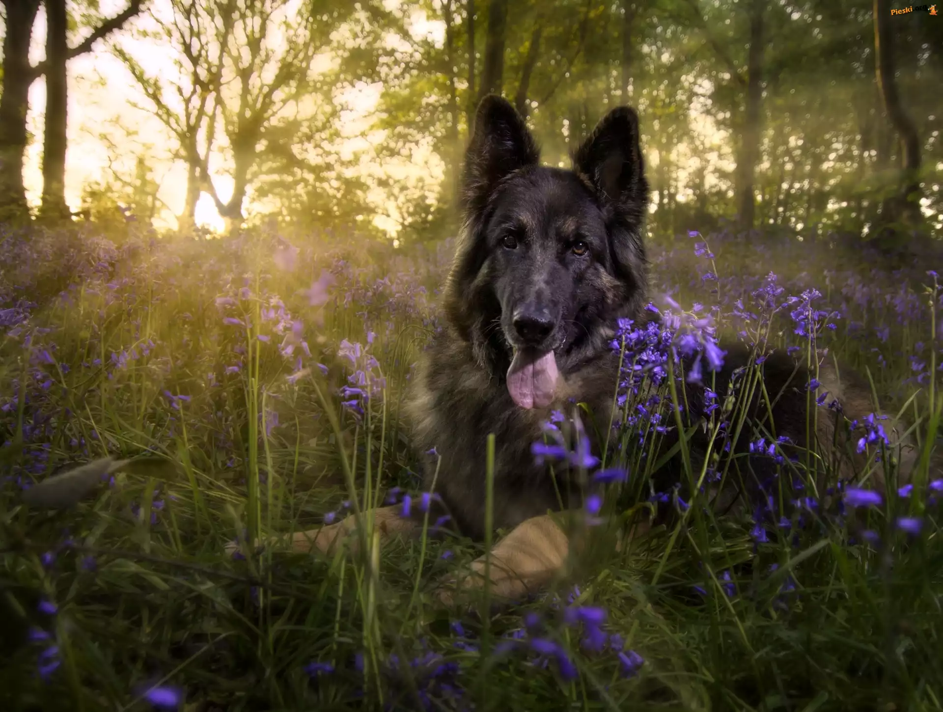 Kwiatki, Pies, Promienie, Niemiecki, Owczarek, Las, Słońca, Pieski