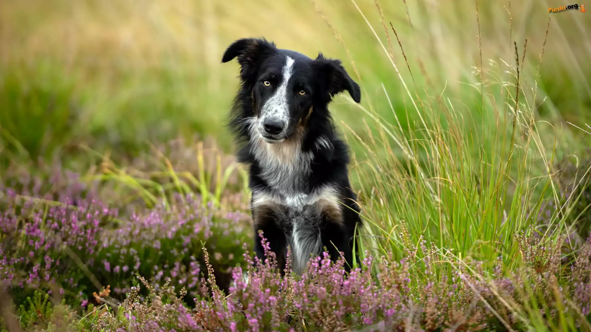 Wrzosy, Pies, Biało-czarny, Border collie, Trawa, Pieski