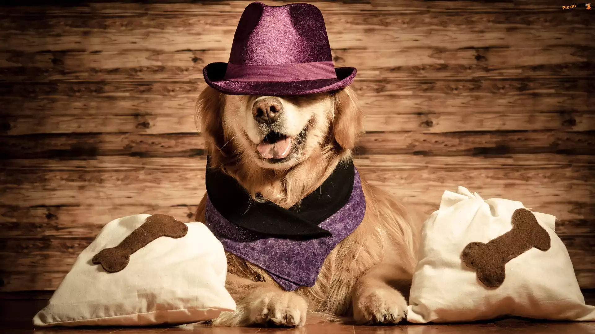 Pies, Poduszki, Chusta, Golden retriever, Kapelusz, Śmieszne, Pieski