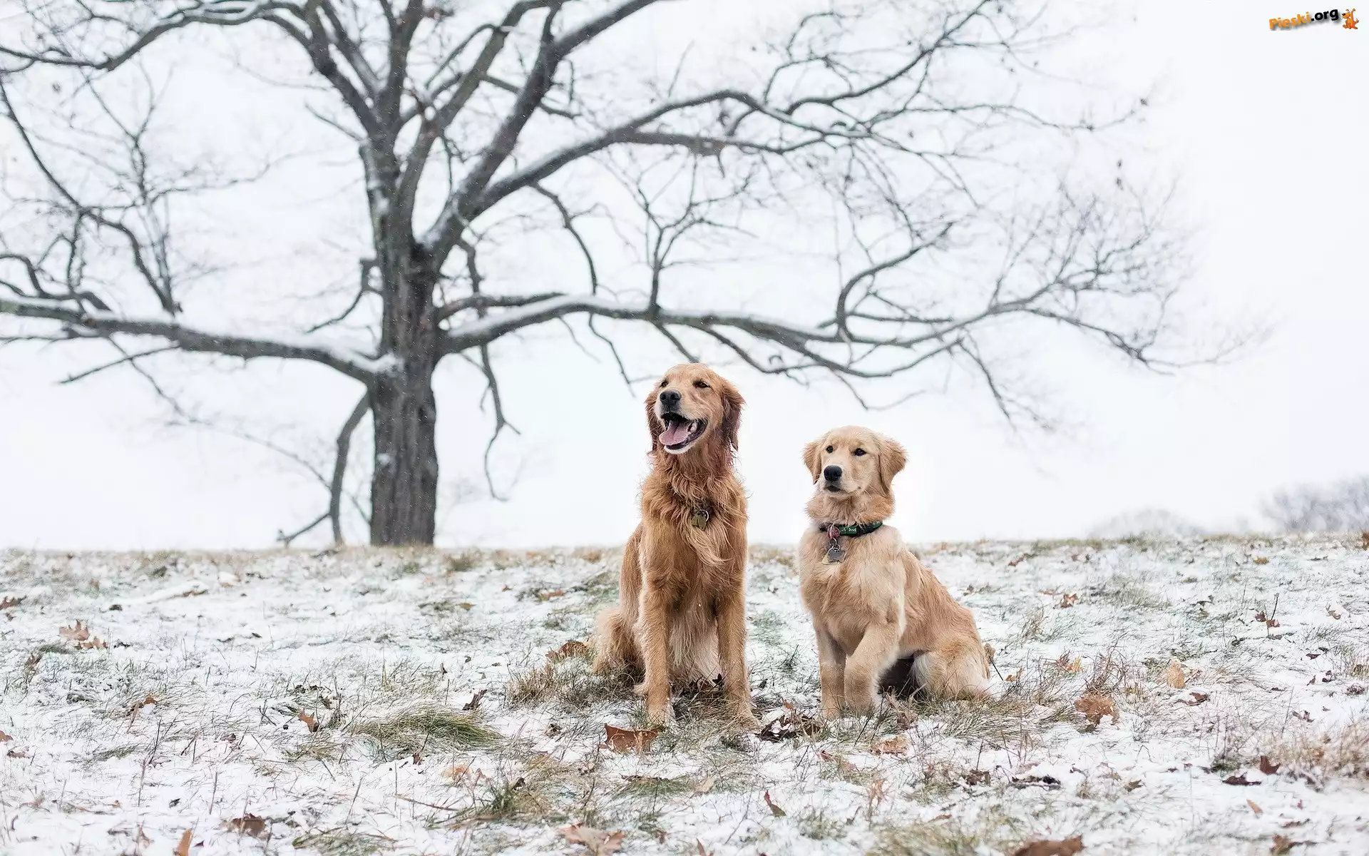 Psy, Zima, Dwa, Drzewo, Pieski