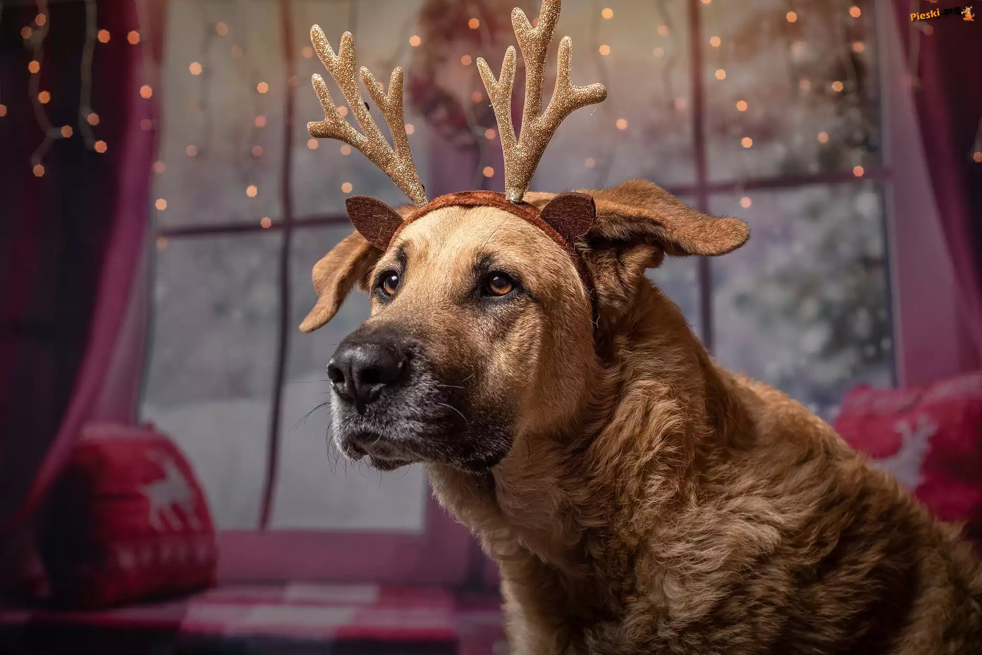 Światełka, Rogi, Pies, Renifer, Okno, Pieski