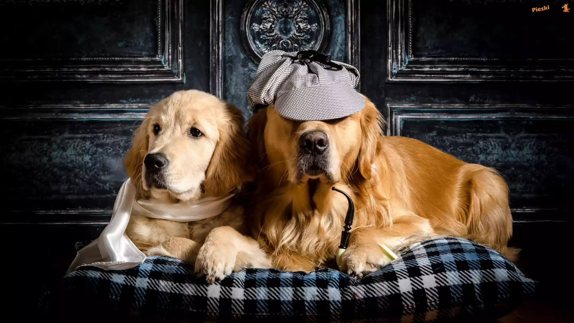 Poduszka, Psy, Golden retriever, Dwa, Szal, Czapka, Pieski