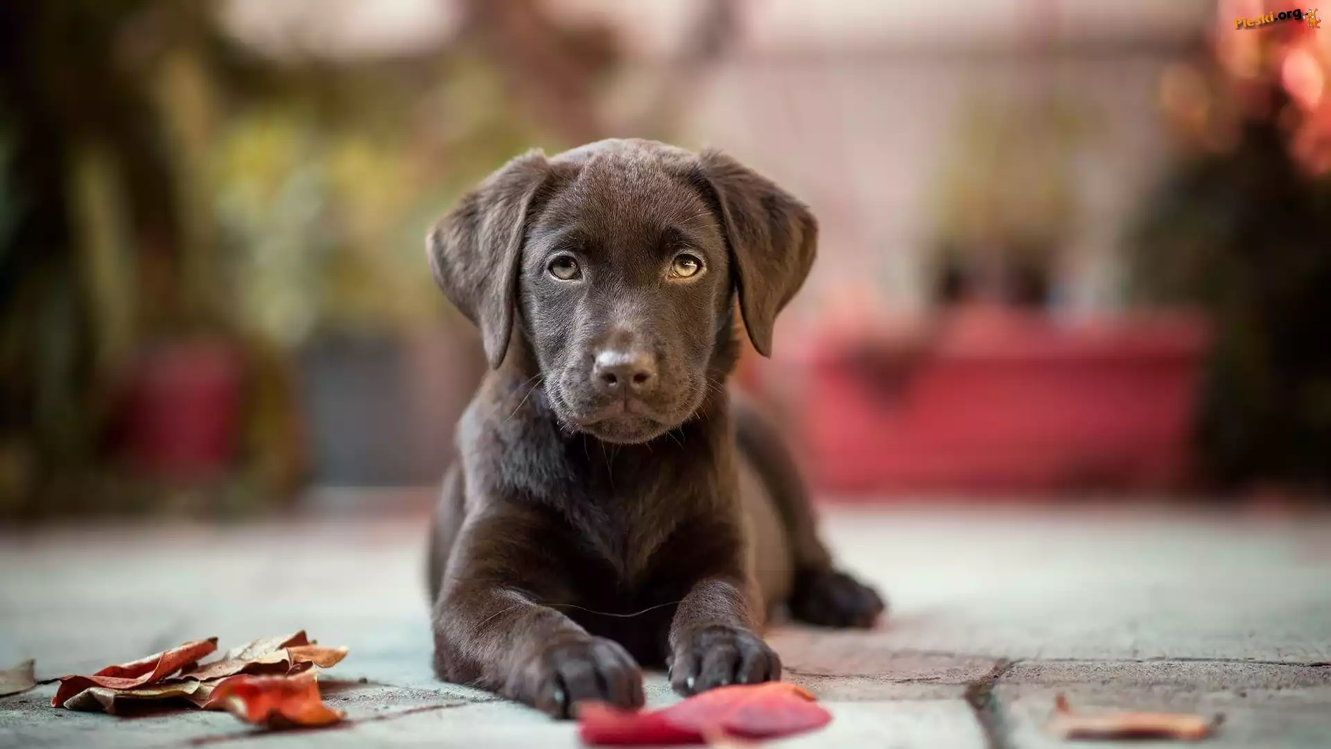 Czekoladowy, Rozmyte, Chodnik, Labrador retriever, Liście, Tło, Pieski