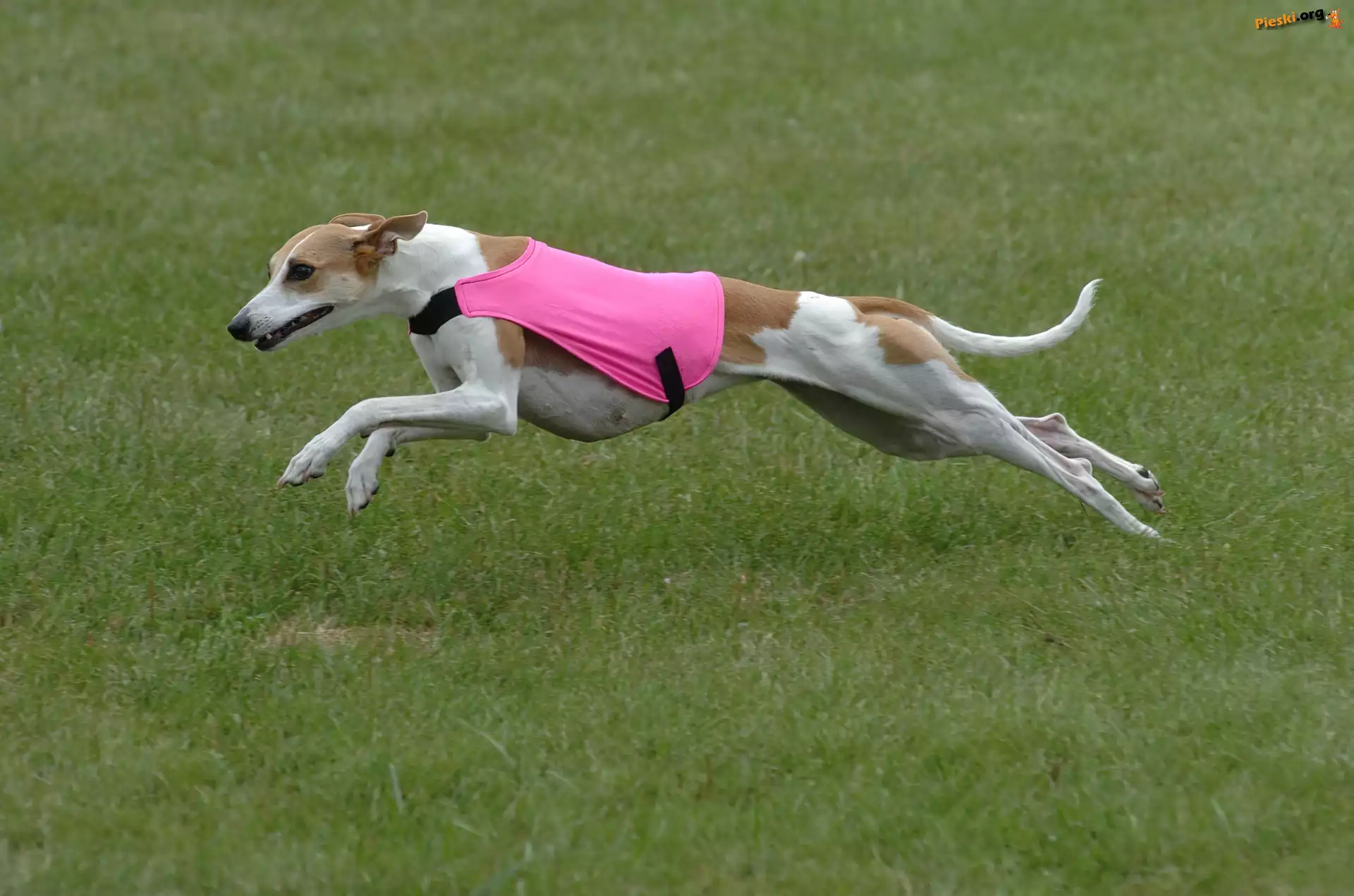 Whippet Whippet, zielona, trawa Whippet, zielone, liście Mordka, Pies, Whippet, Liście Whippet, różowe, ubranko