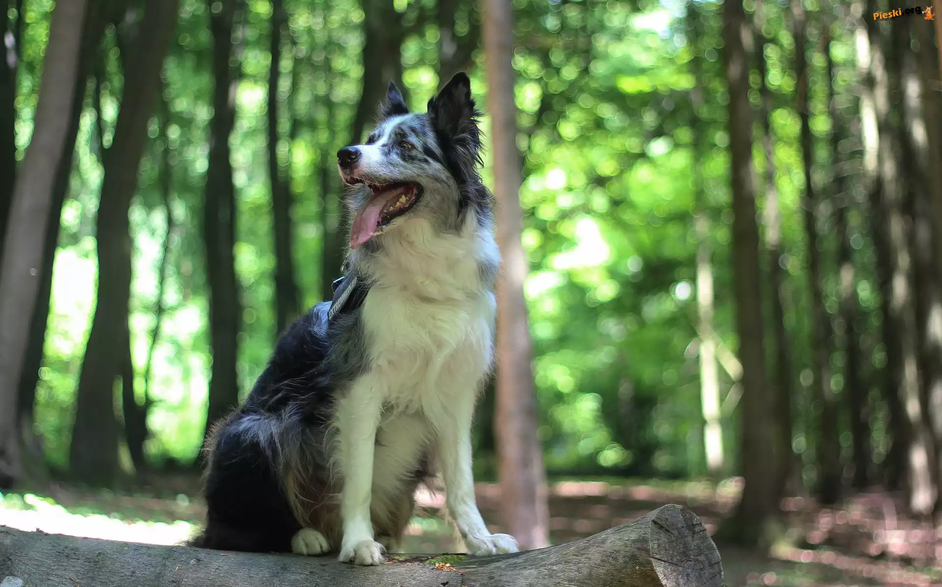 Las, Siedzący, Drzewa, Border collie, Pies, Kłoda, Bokeh, Pieski