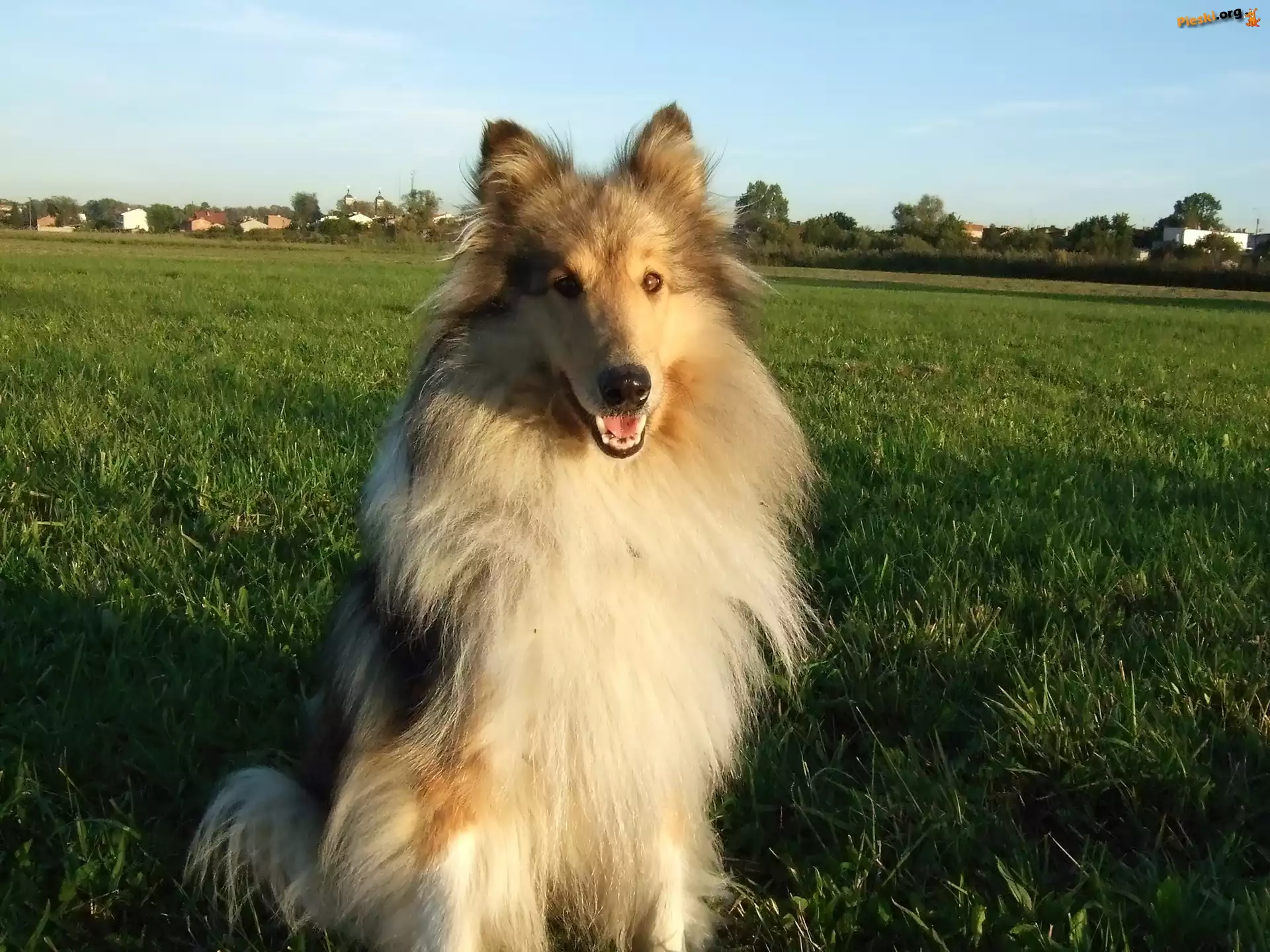 Siedzący, Owczarek szkocki długowłosy, łąka