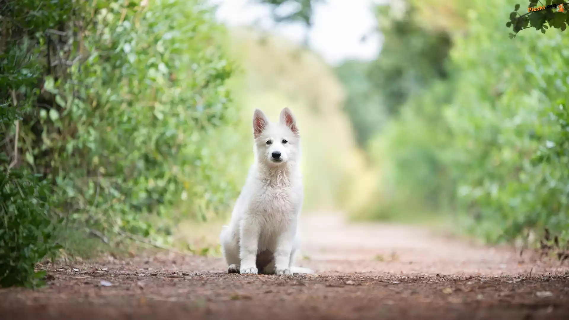 Krzewy, Szczeniak, Pies, Biały owczarek szwajcarski, Alejka, Pieski