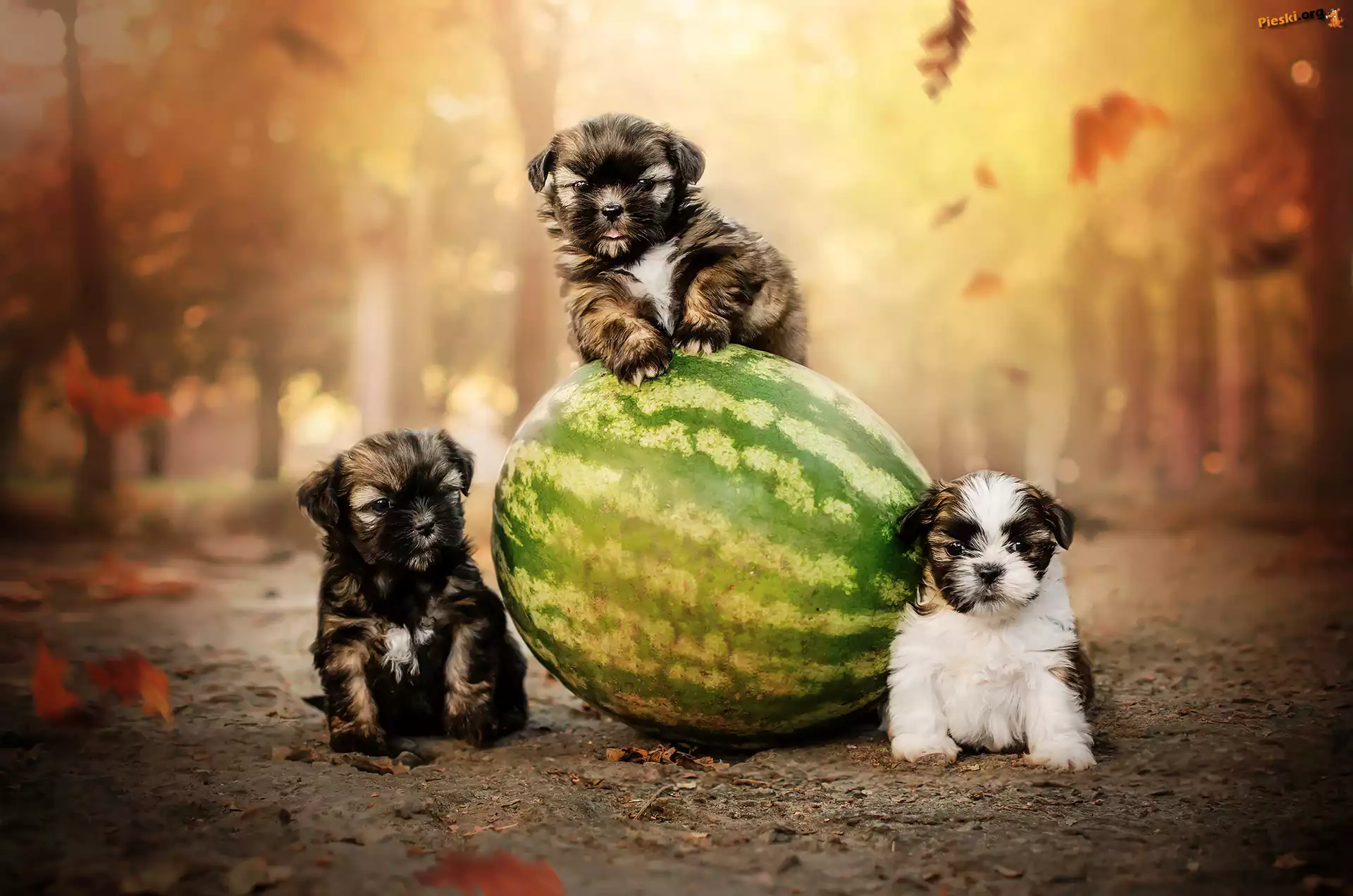 Szczeniaki, Psy, Trzy, Arbuz, Pieski