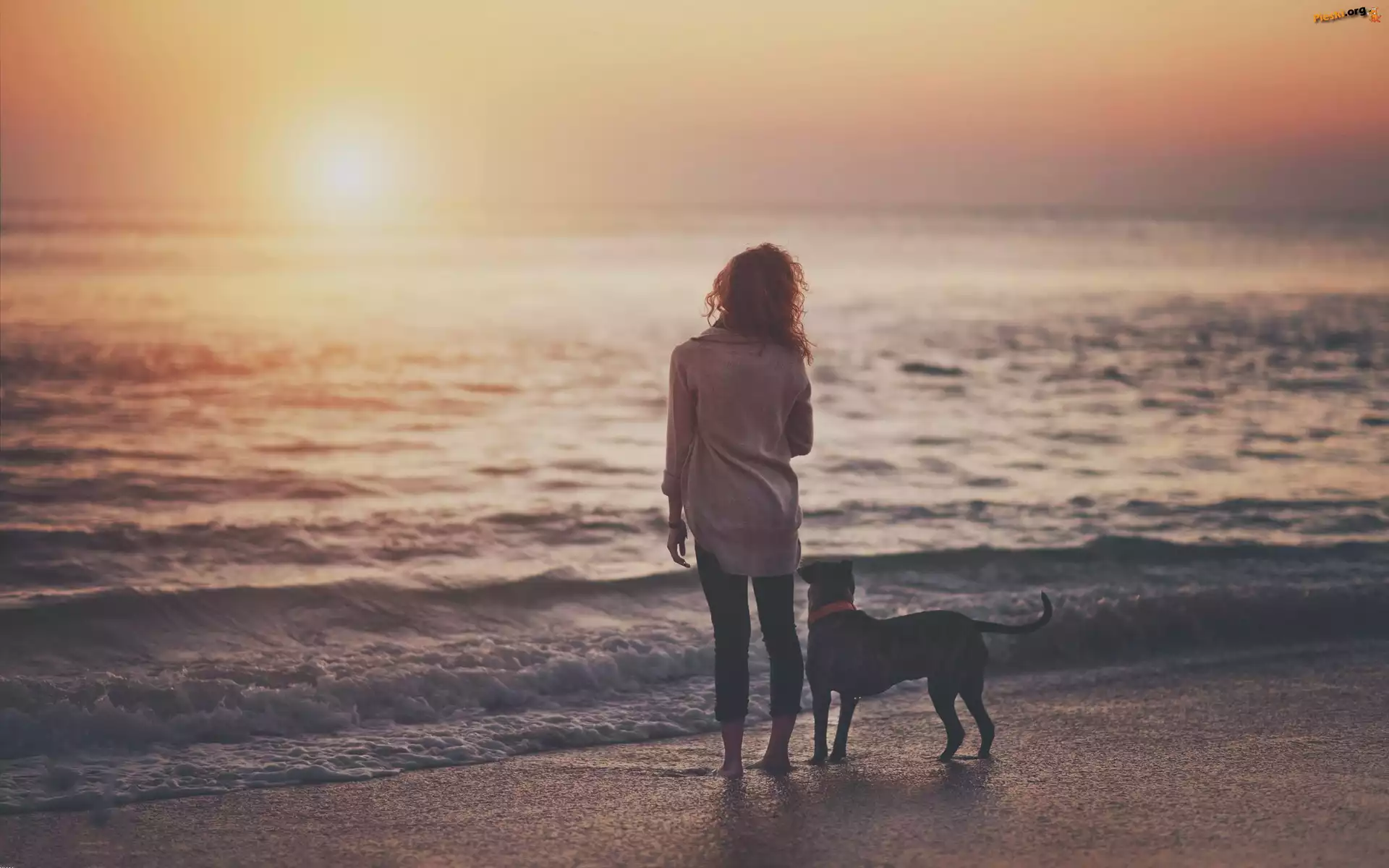 Zachód, Morze, Kobieta, Amstaff, Słońca