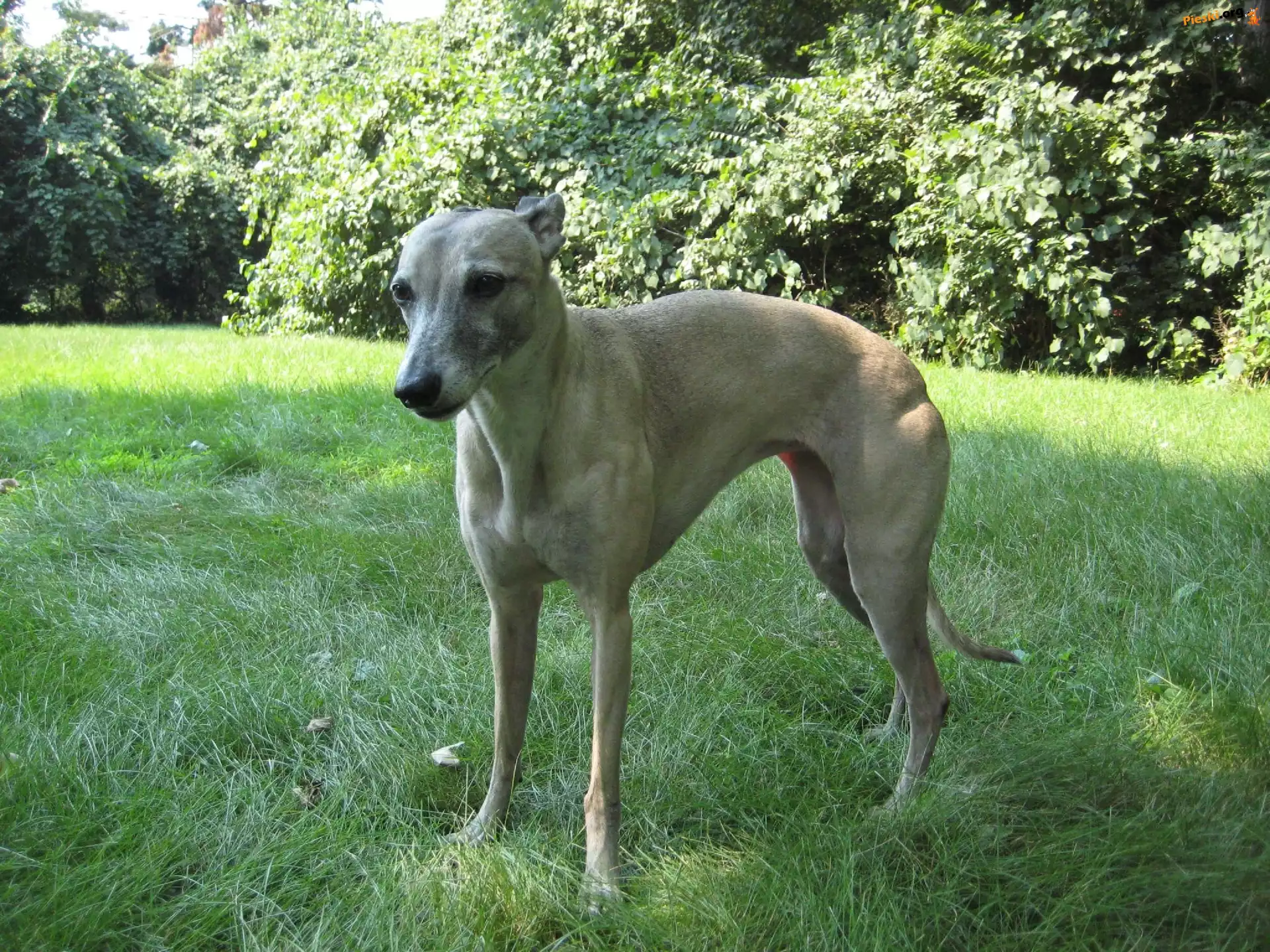 Whippet Whippet, zielona, trawa Whippet, zielone, liście Mordka, Pies, Whippet, Liście Whippet, różowe, ubranko
